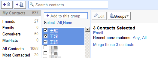 2) 和手机同步了以后不要随便在手机上删人啦, 因为这也会让 Gmail 里面对应的人消失, 继而产生如前所述的连锁反应. 以前有人换号码我是习惯把老的号码整个删掉, 再新建一个, 现在可不能这么干了.